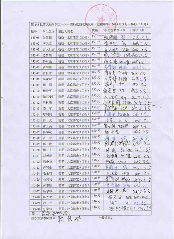 第143批l蒗渠中学(2015年3月-2015年8月)受助学生签字确认单