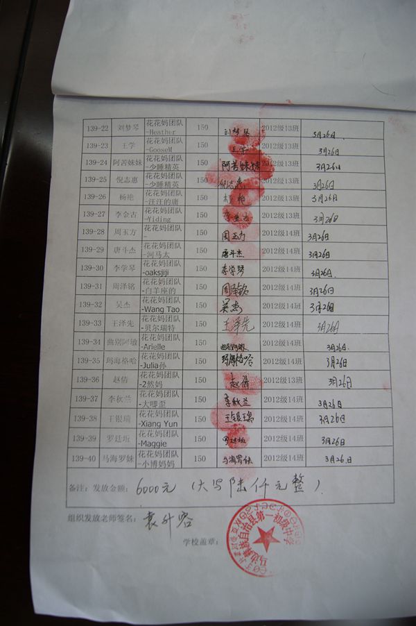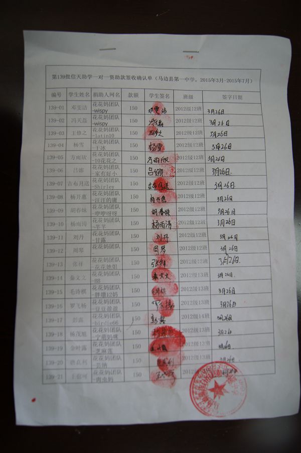 第139批马边第一初中(2015年3月-2015年7月)信天助学发款签收单: