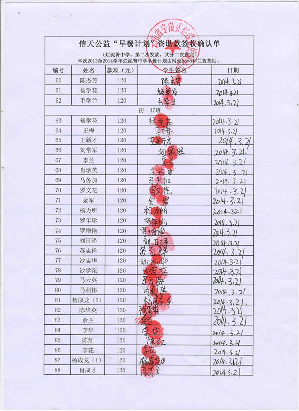 烂泥箐中学,2013-2014年早餐计划第二次发款签收单