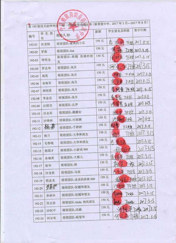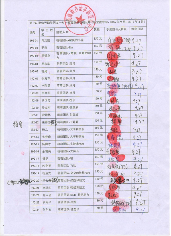 192-12王丽芳,因中途辍学,资助转给 杨勇;