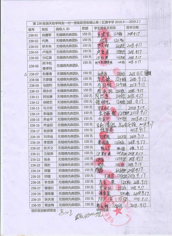 第238批红旗中学(2018年9月-2019年2月)受助学生签收确认单