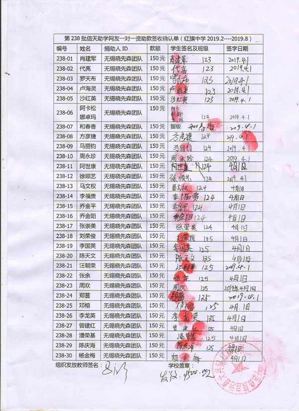 第238批红旗中学(2019年3月-2019年7月)受助学生签收确认单