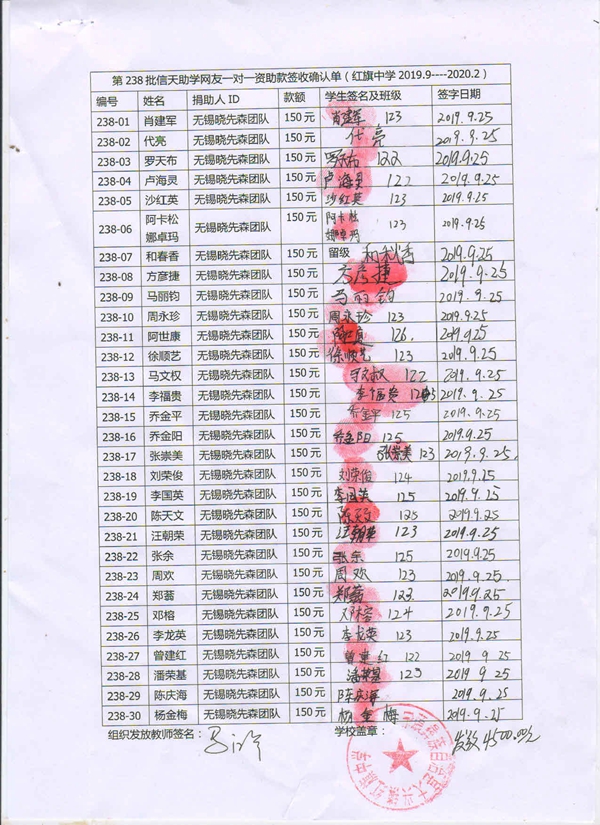 » 第238批受助学生名单(红旗中学初一30名,无锡晓先森团队)