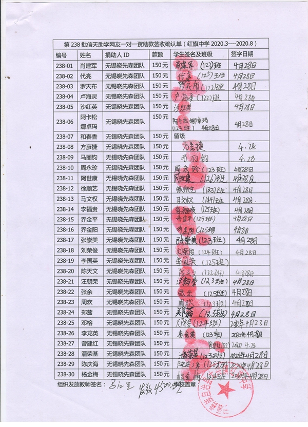 第238批红旗中学(2020年3月-2020年8月)受助学生签收确认单
