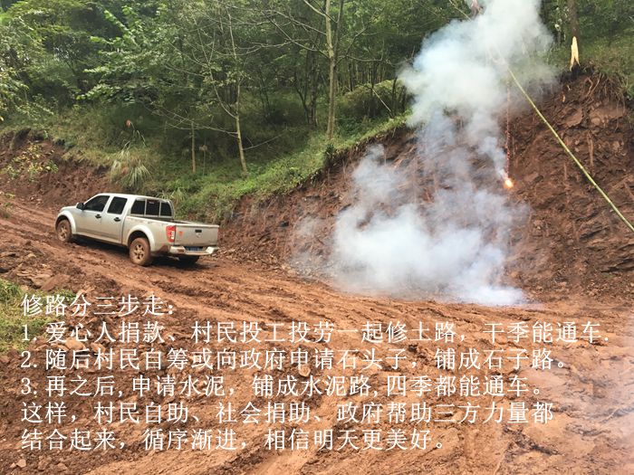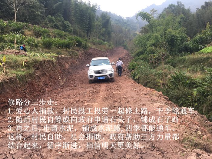 (1)爱心人捐款、村民投工投劳一起修土路,干季能通车;