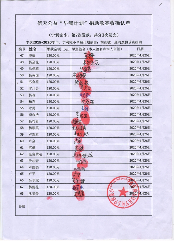 宁利中心校,2019-2020年早餐计划第二次发款签收单