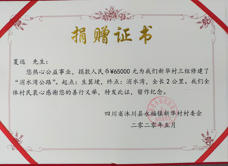 捐赠证书。