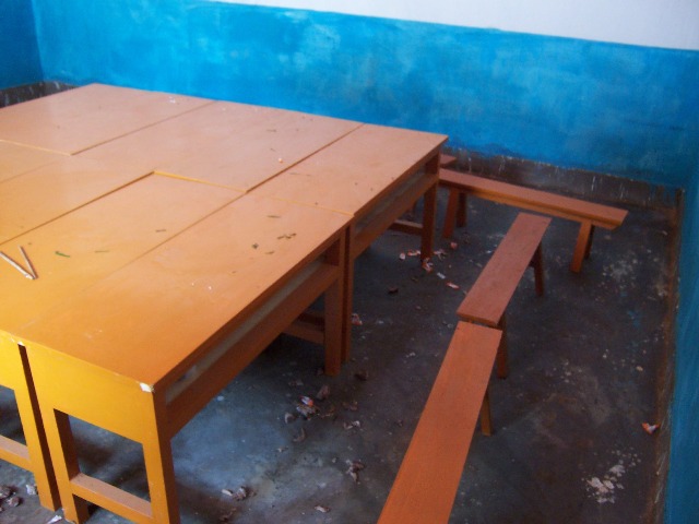 教室里面崭新的黑板、桌椅、天花板