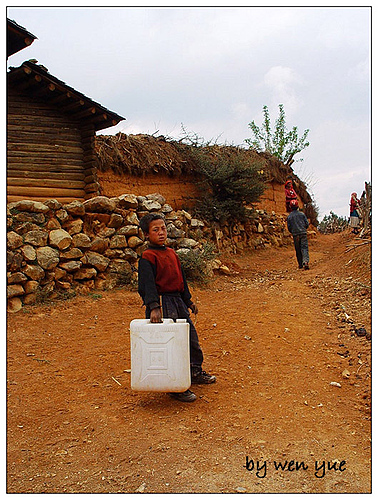 我无语。看着她背着一大桶水,腰几乎弯成了九十度,踟躇着地往回走,她的身影在开阔的大山里显得分外地渺小。