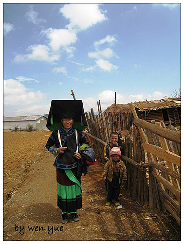 眼前的彝族大妈带着小孙子,岁月的风霜,生活的艰辛,全部刻在一道道皱纹里。她不太会说汉语,指指我手里的相机,我给她照了张相,她看看屏幕上的自己,说:老了,老了------年轻的彝族妇女邀请我去她家喝水,我婉拒了她的好意。
