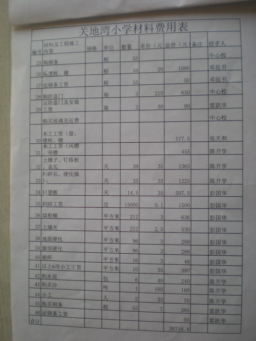 注:所有地基平整费用:3000元(由村民尽义务)操场石子3000元(由村民尽义务) ,不含在总预算内。
