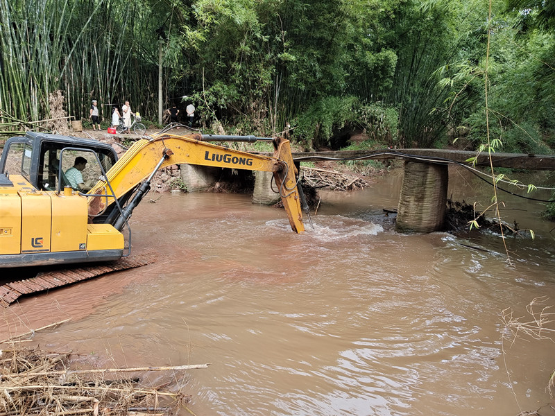 为了修桥,先用挖掘机探索深度和桥基。