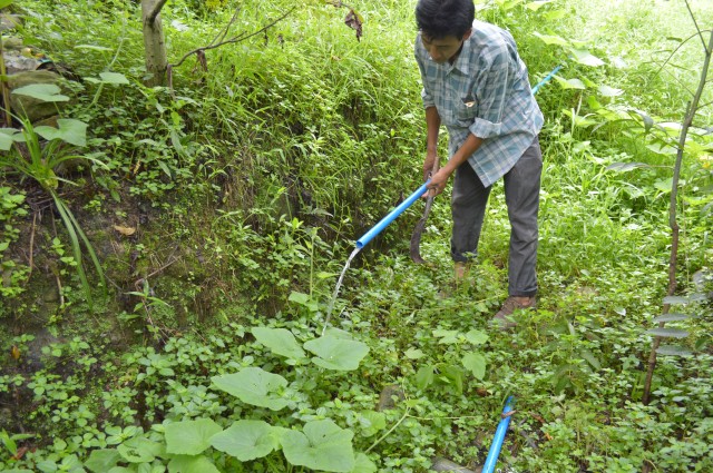 水已经引到学校前后一百米处的小树林里,准备在这里修一个蓄水池.