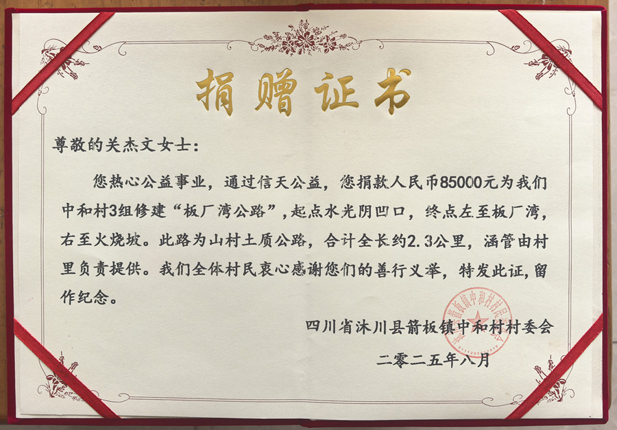 捐赠证书。