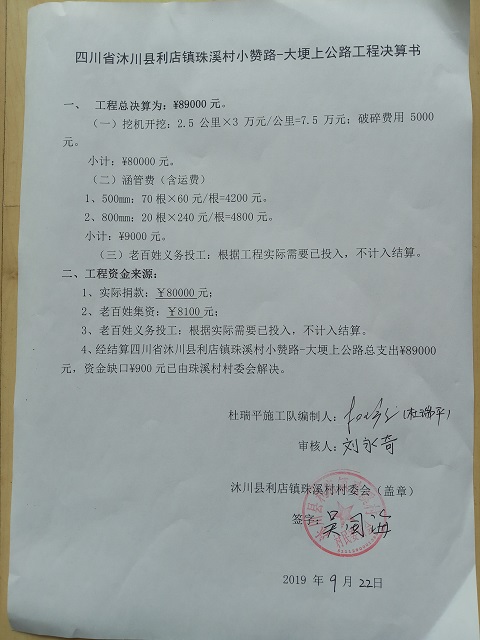 (5)修路预算分好几部分,有挖掘机、涵管、炸药爆破(山崖需要爆破)、堡坎、村民义务工、征地等。修路,我们不全包,我们出一大部分钱:挖掘费用、山崖爆破等。村民出义务工、涵管、征地费、村民小额集资。