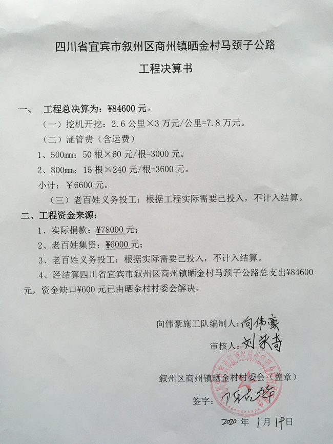 (5)修路预算分好几部分,有挖掘机、涵管、炸药爆破(山崖需要爆破)、堡坎、村民义务工、征地等。修路,我们不全包,我们出一大部分钱:挖掘费用、山崖爆破等。村民出义务工、涵管、征地费、村民小额集资。