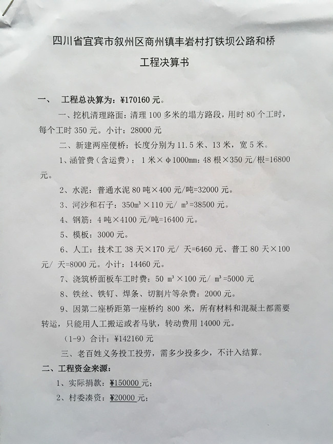 以上合计总价:¥170160元,村委凑集:¥20000元,尚有资金缺口¥150160元。