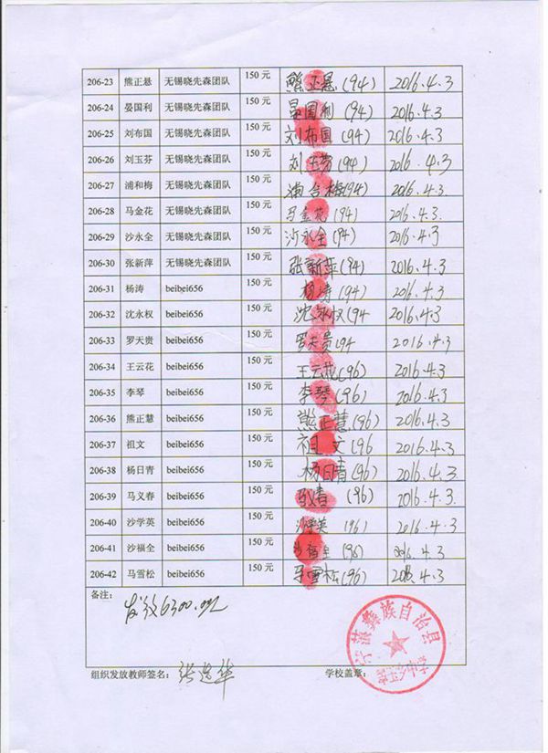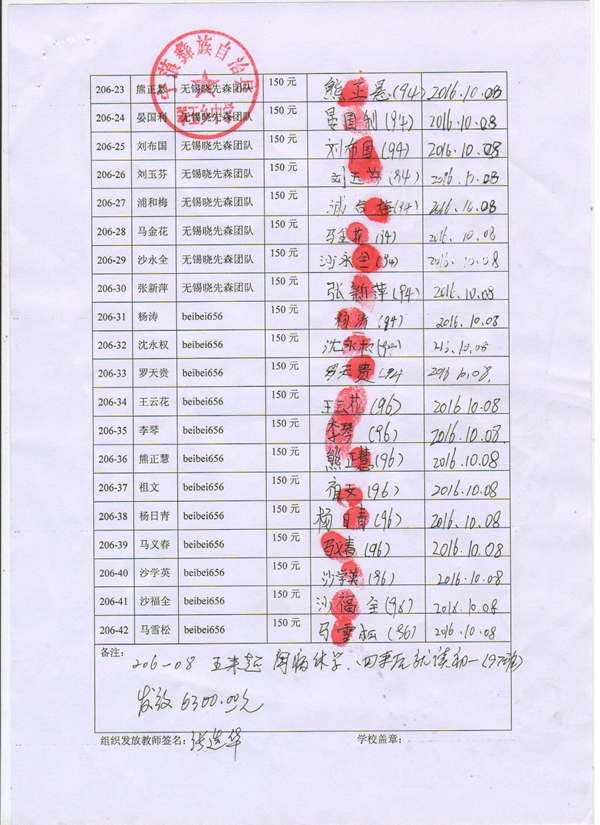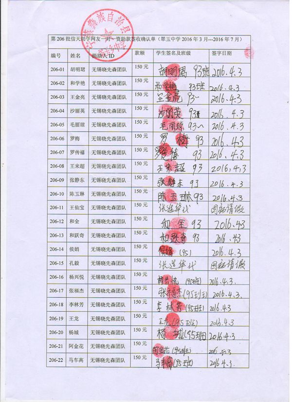 第206批翠玉中学(2016年3月-2016年7月)受助生签收单