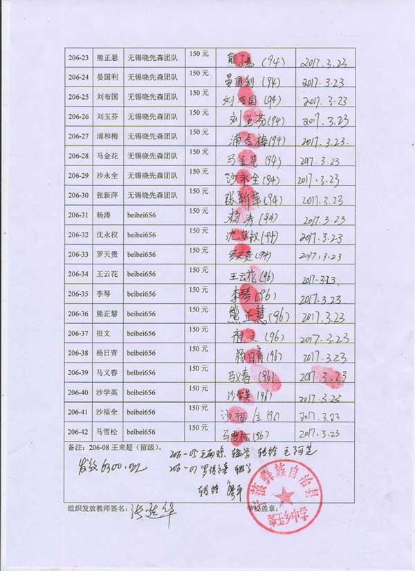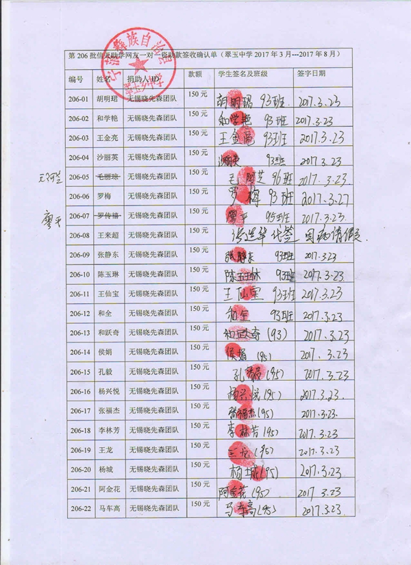 第206批翠玉中学(2017年3月-2017年8月)受助生签收单
