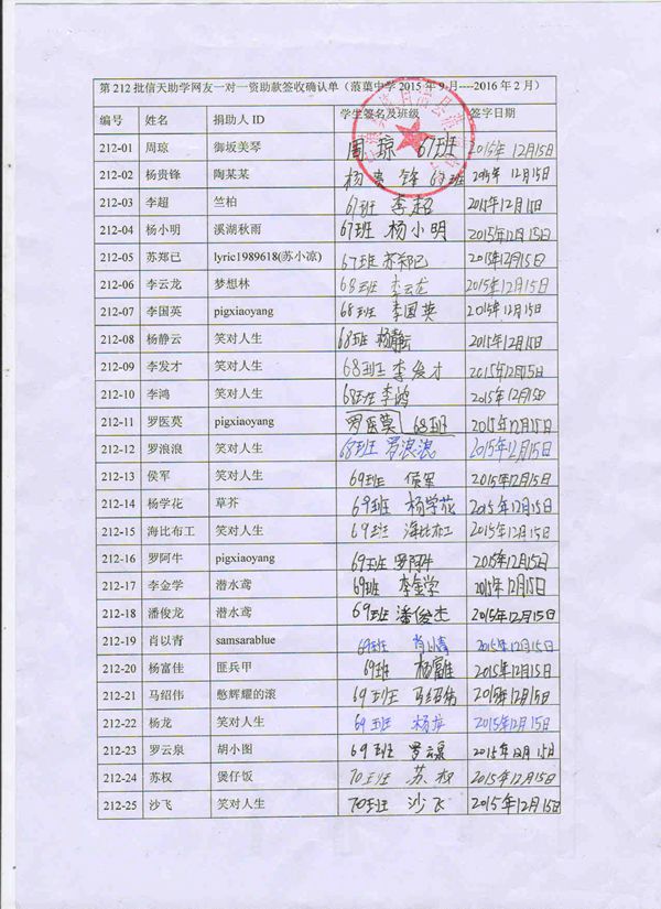 第212批蒗渠中学(2015年9月-2016年2月)受助学生签字确认单