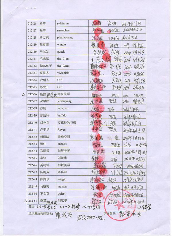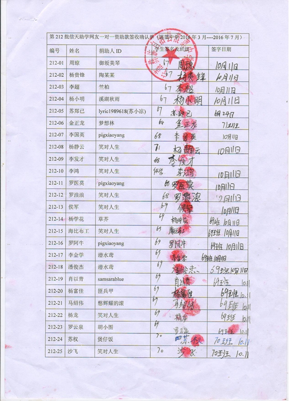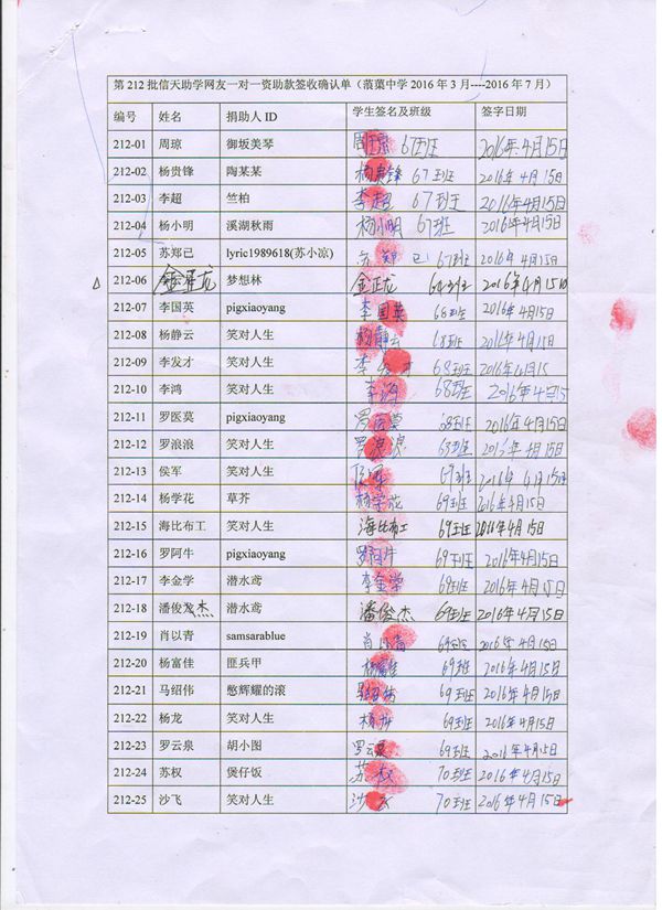 第212批蒗渠中学(2016年3月-2016年7月)受助学生签字确认单