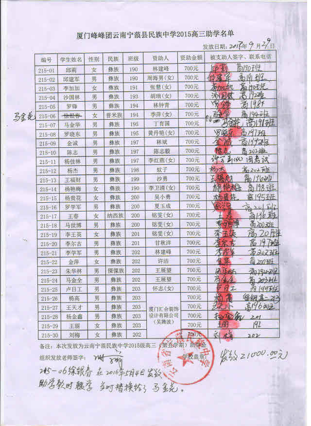 标题: 第215批受助学生名单(宁蒗民中30名,厦门峰峰团捐)