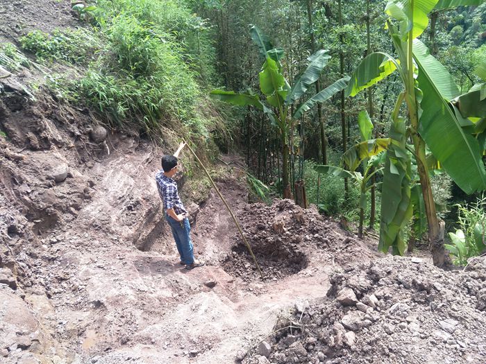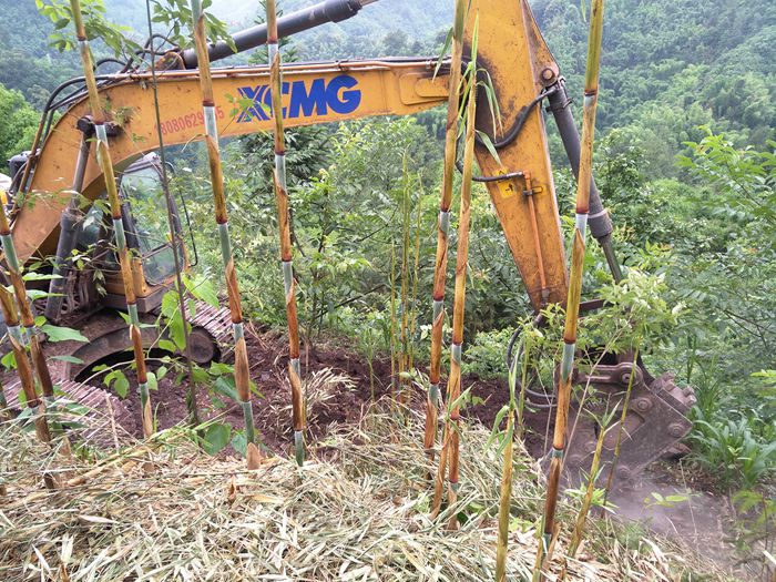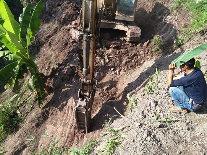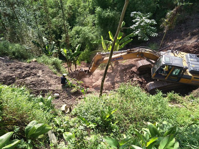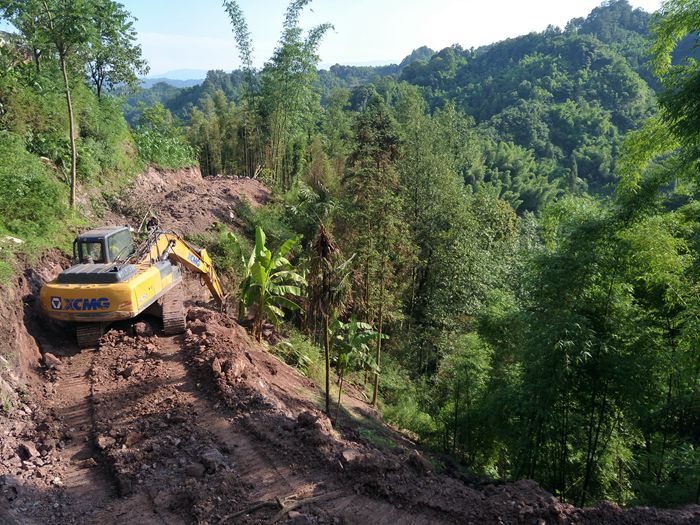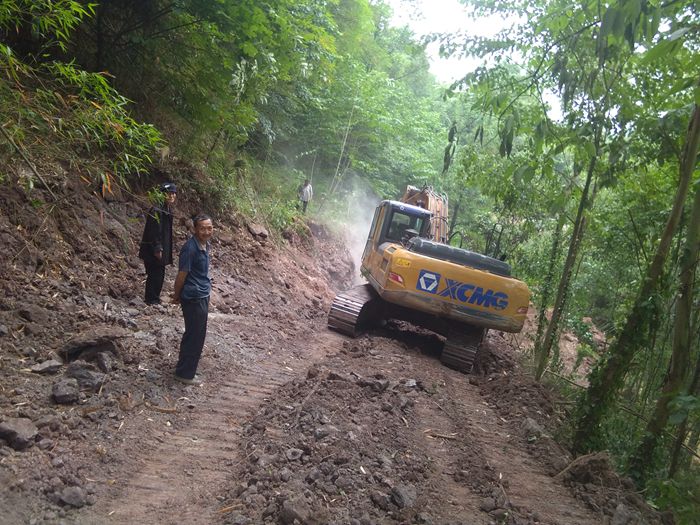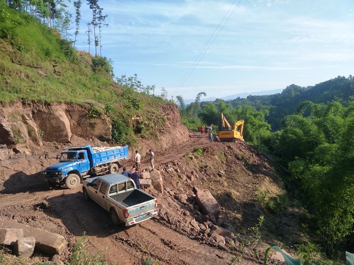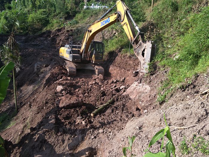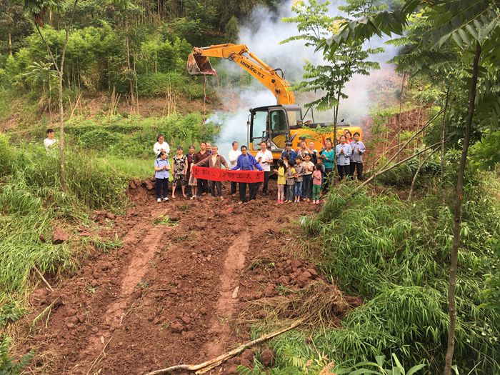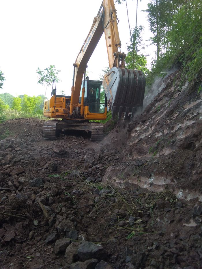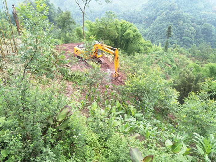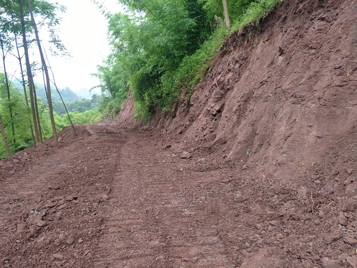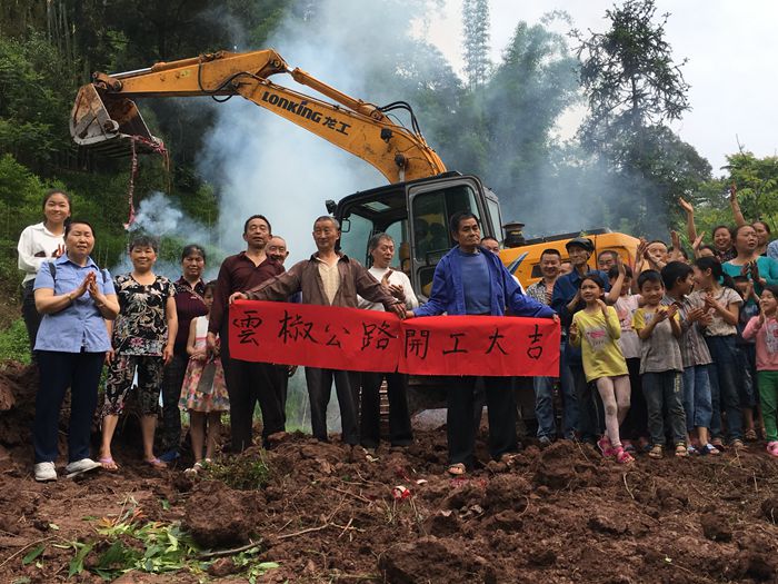 云椒公路位于四川省乐山市沐川县大楠镇麻秧村12组。该工程于2018年5月19日动工,两台挖掘机施工(一台破碎,一台挖斗),施工到2018年6月1日,挖到村民吴德兴房子下面,里面全是石头,上面是他房子的柱子,不能用破碎,因为破碎的振动会对他房子的栏子有影响,便会造成房子的影响,发生更大的危害,外面也有一处悬空约5米多,挖掘机无法挖过去,大家想了办法,只好把挖掘机往回开,绕回去,从对面挖过来。到2018年6月3日,经信天、捐款人卢总到现场考察,根据实际需要修建堡坎。