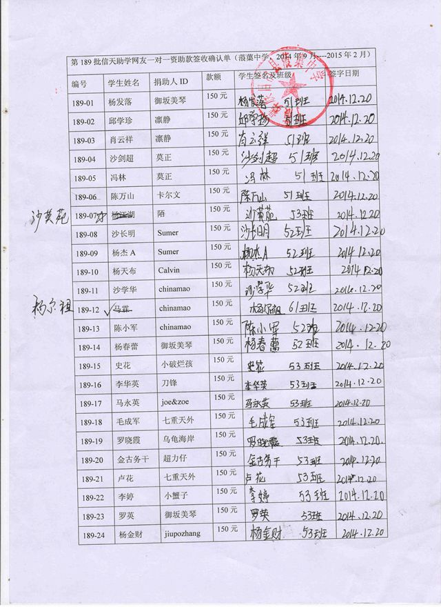 sumer 在2014年10月15日已通过淘宝付款留言,随机资助两名初中学生,随机选择189-08---沙长明,189-09---杨杰A;淘宝店已确认收款,并在第1页帖子中记录了。
