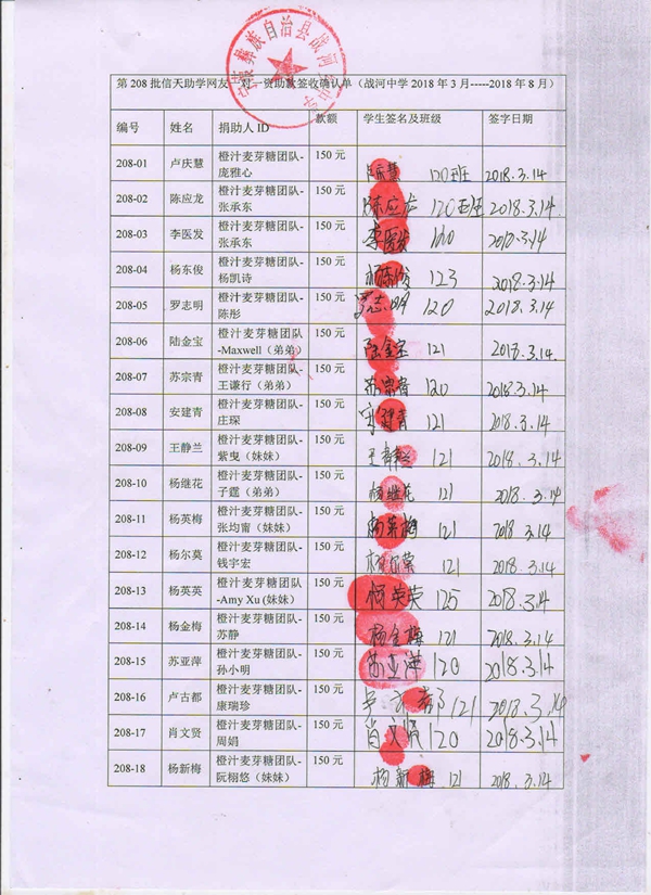 第208批战河中学(2018年3月-2018年8月)受助学生签字确认单
