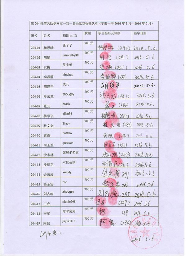 第204批宁蒗一中(2016年3月-2016年7月)受助学生签字确认单:
