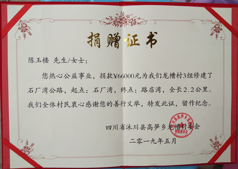 捐赠证书。