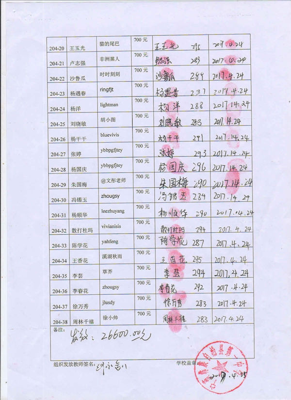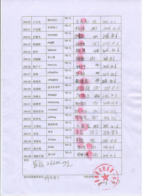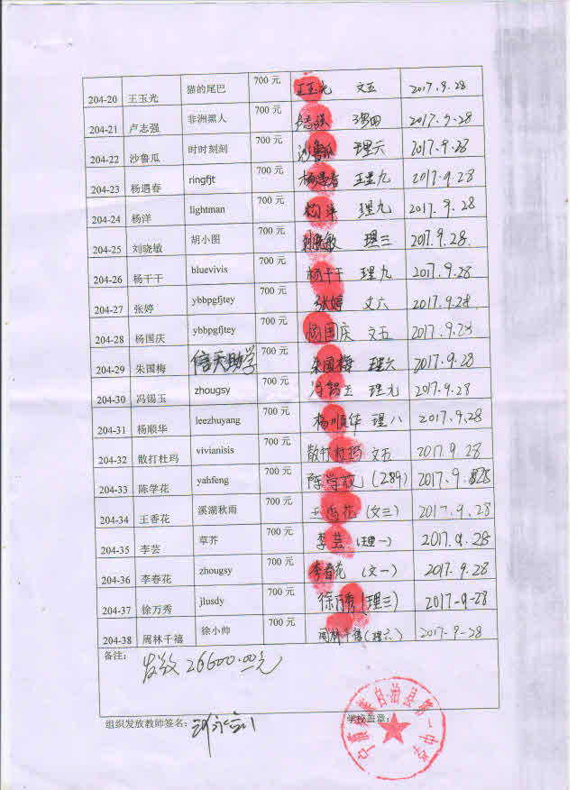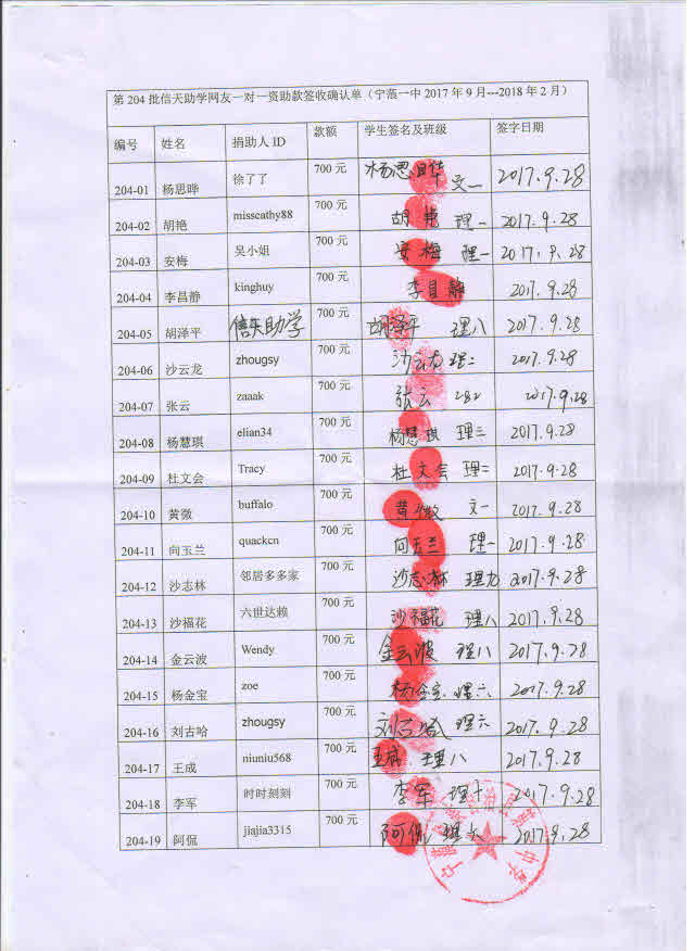 第204批宁蒗一中(2017年9月-2018年2月)受助生签收单