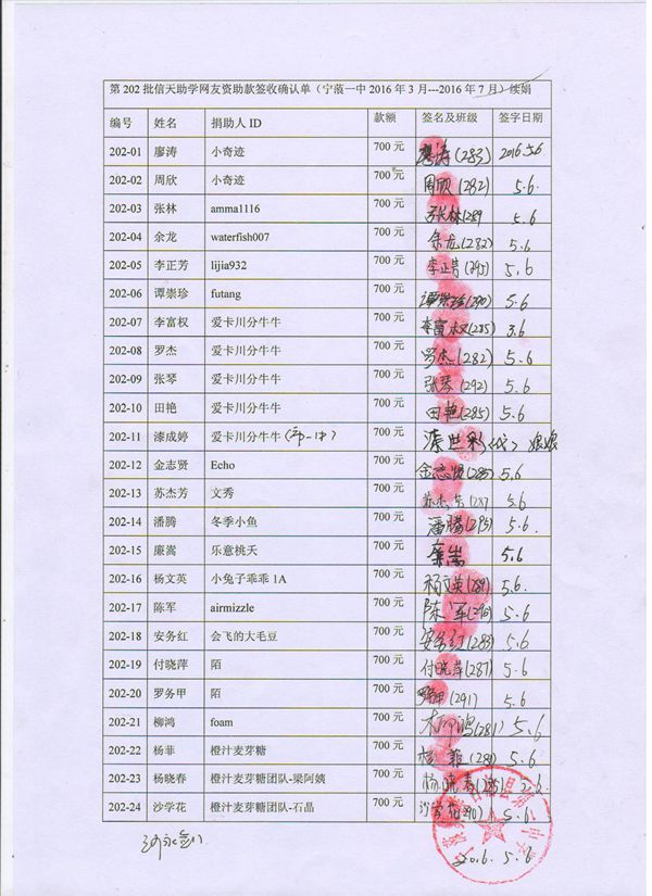 第202批宁蒗一中(2016年3月-2016年7月)受助生签收单