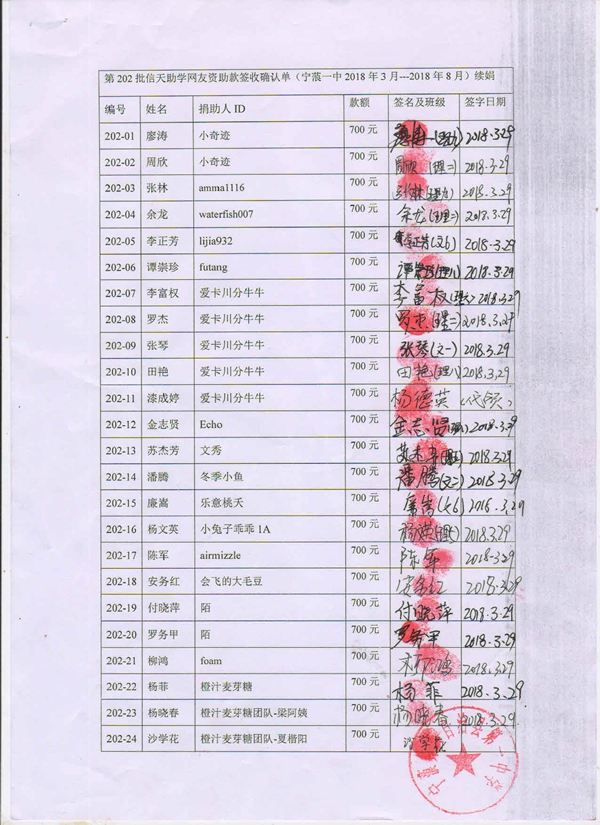 第202批宁蒗一中(2018年3月-2018年8月)受助学生签字确认单:
