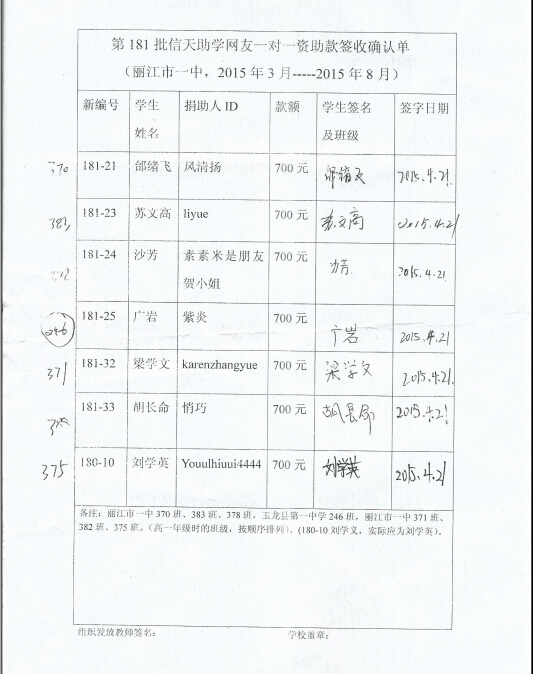 注:在签收单上,见附表的,几名学生是就读于丽江市一中,负责的老师正在发款了,相关的签收单随后补充。