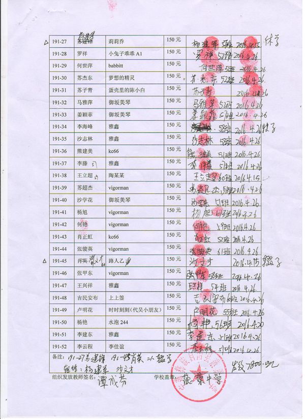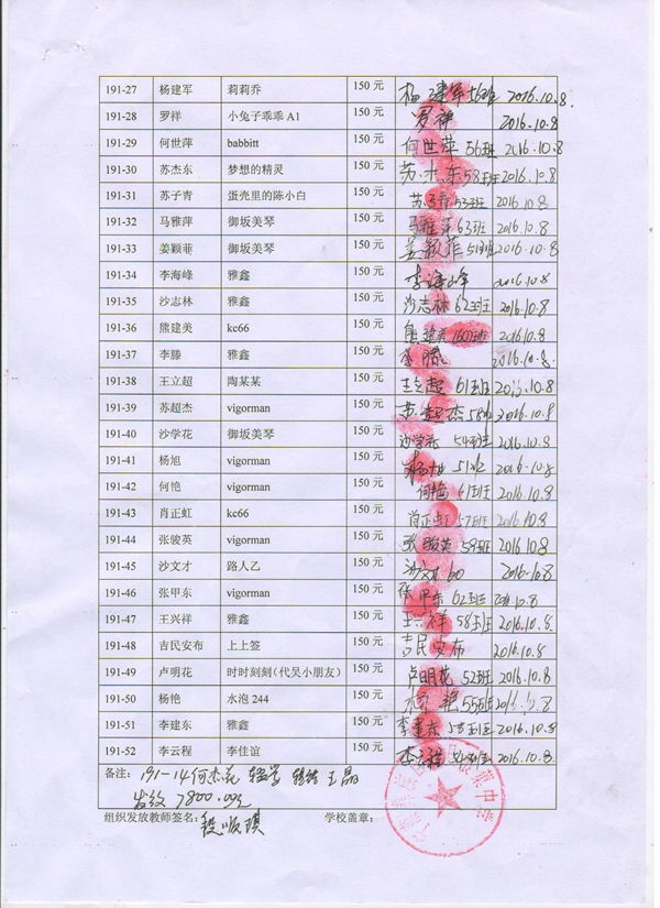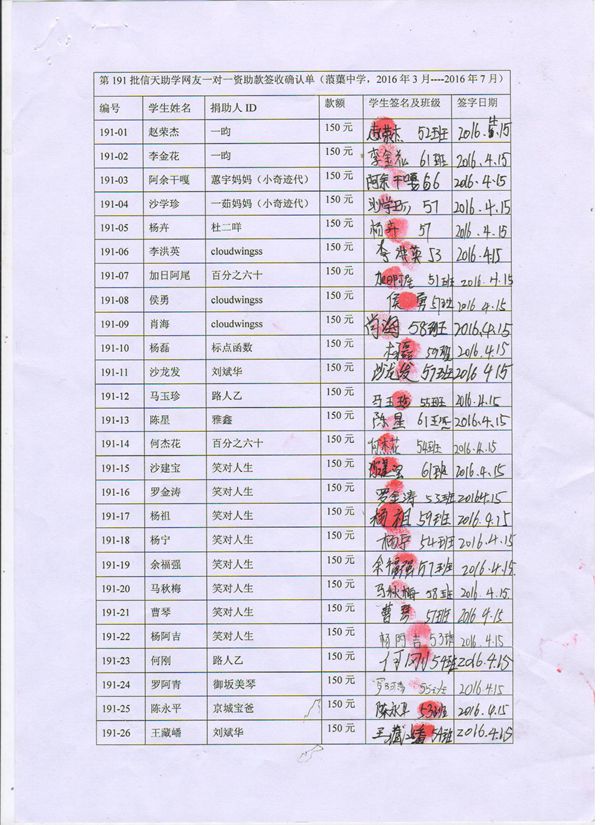 第191批蒗渠中学(2016年3月-2016年7月)受助学生签字确认单