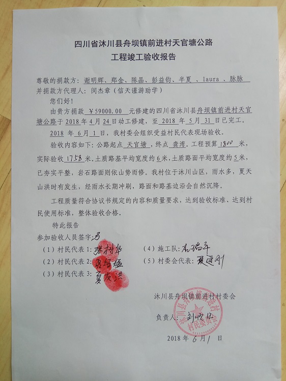 (1)爱心人捐款、村民投工投劳一起修土路,干季可以通车;