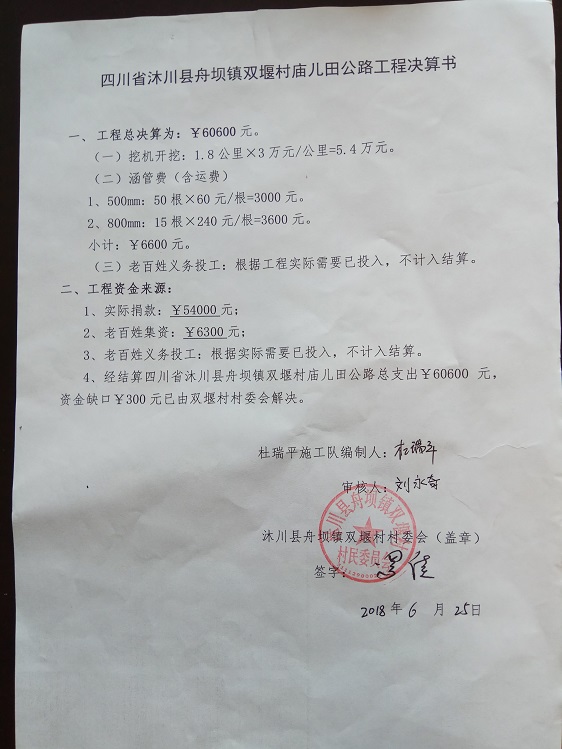 (5)修路预算分好几部分,有挖掘机、涵管、炸药爆破(山崖需要爆破)、堡坎、村民义务工、征地等。修路,我们不全包,我们出一大部分钱:挖掘费用、山崖爆破等。村民出义务工、涵管、征地费、村民小额集资。