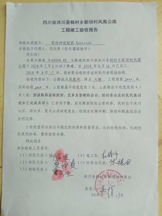 凤凰公路位于四川省沐川县杨村乡新坝村2组,全长约2公里,起点:凤凰湾,终点:大槽,受益农户23户,直接受益人数99人,间接受益人数约850人(周边的人也走此路)。此路能给老百姓解决交通运输困难,更重要的是解决小学生上学难的问题。村民修路决心很大,全力集资,400元/户,共集资9200元,计划修通土路、支路、涵管、并铺设部份路面块石,力争雨季也能通车。
