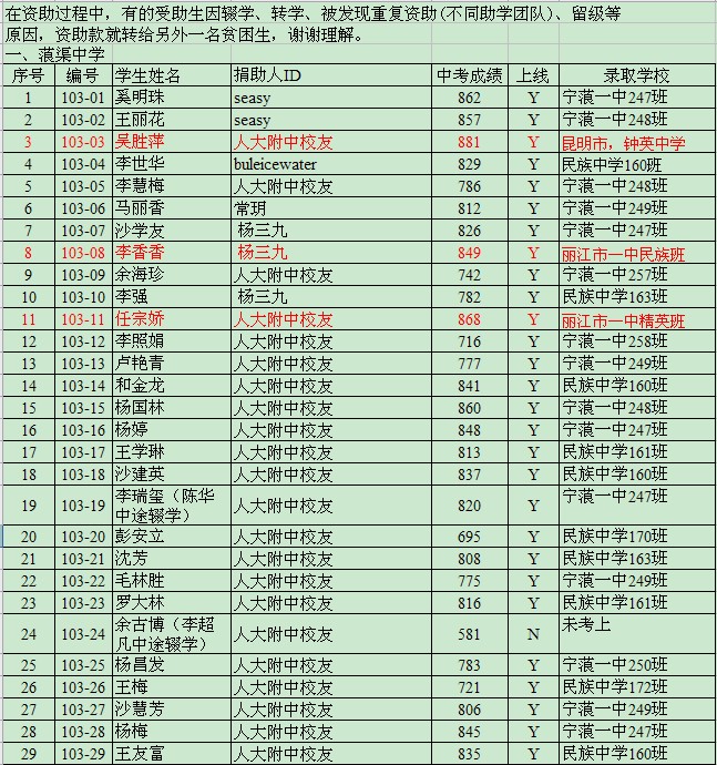 注:红色标记是考得较好的同学,被省城昆明或者地级市丽江的“名校”录取。