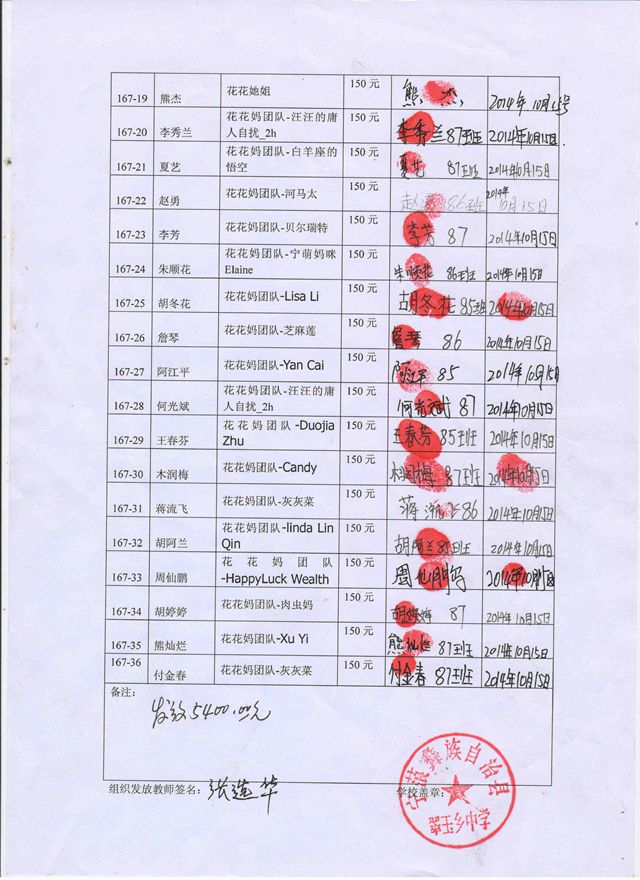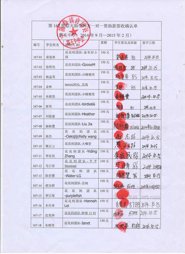 第167批翠玉中学(2014年9月-2015年2月)受助生签收单