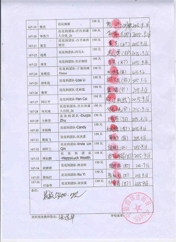 第167批翠玉中学(2016年3月-2016年7月)受助生签收单