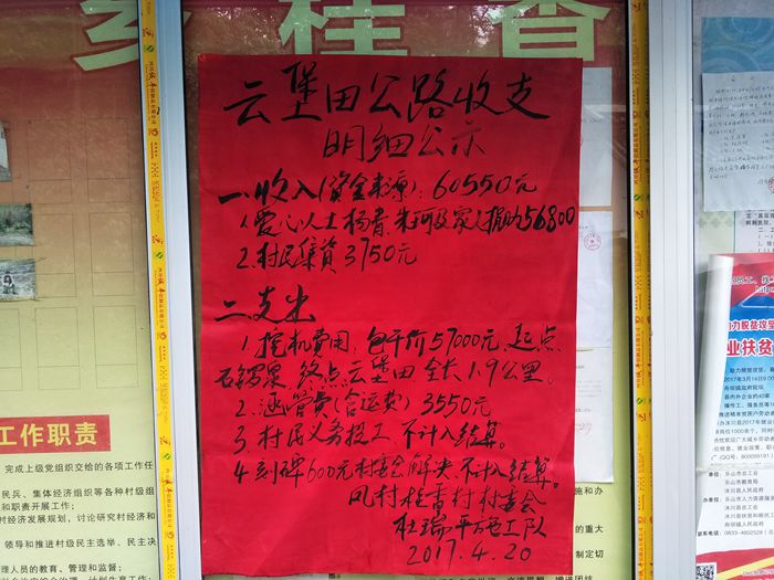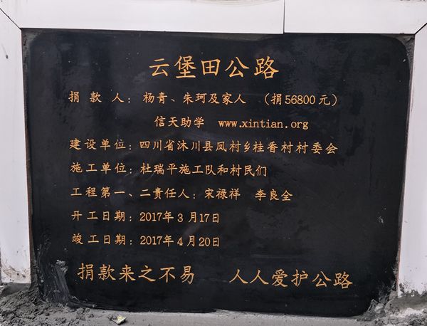 我们修的路是山村“毛细血管”,是连接小组(原生产队)之间的山路,政府村村通公路(在当地是指行政村的路),四川的山很多,蜿蜒崎岖。修路分三步走:1.爱心人捐款、村民投工投劳一起修土路,干季能通车;2.随后村民自筹或向政府申请石头子,铺成石子路;3.再之后,申请水泥,在政府帮助下铺成水泥路,四季都能通车。这样,村民自助、社会捐助、政府帮助三方力量都结合起来,循序渐进,相信明天更美好。