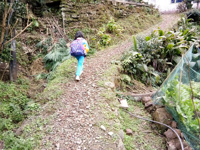 小学生上学之路,等修好了路之后,就可以坐拖拉机上学了,或者骑自行车上学了。