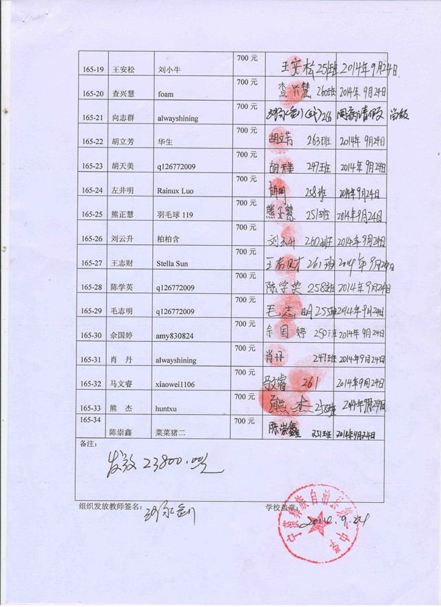 第165批宁蒗一中(2014年9月-2015年2月)受助生签收单