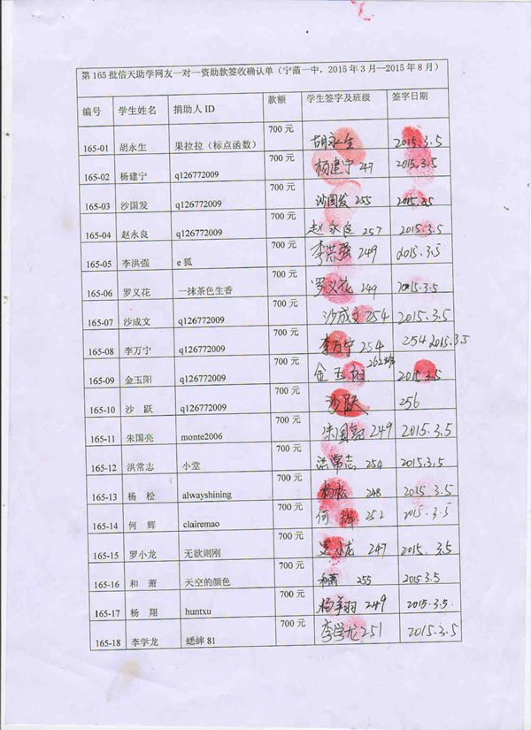 第165批宁蒗一中(2015年3月-2015年8月)受助生签收单