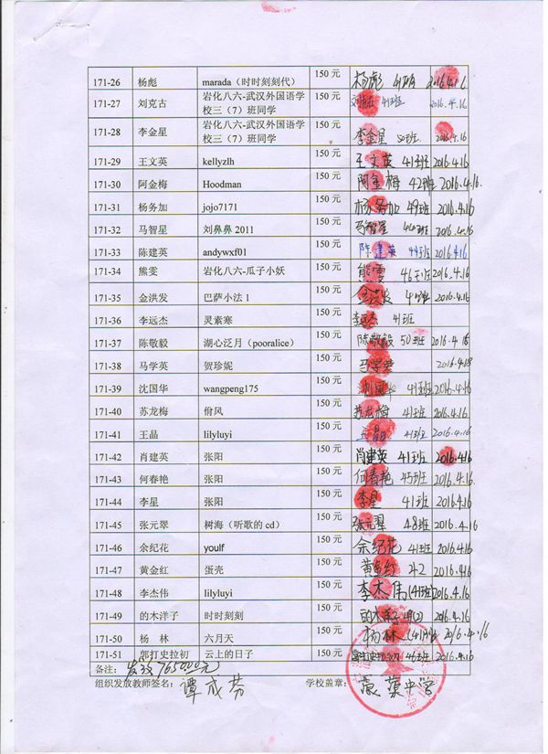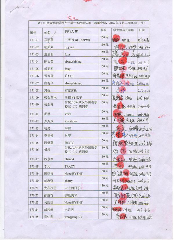 第171批蒗渠中学(2016年3月-2016年7月)受助学生签字确认单