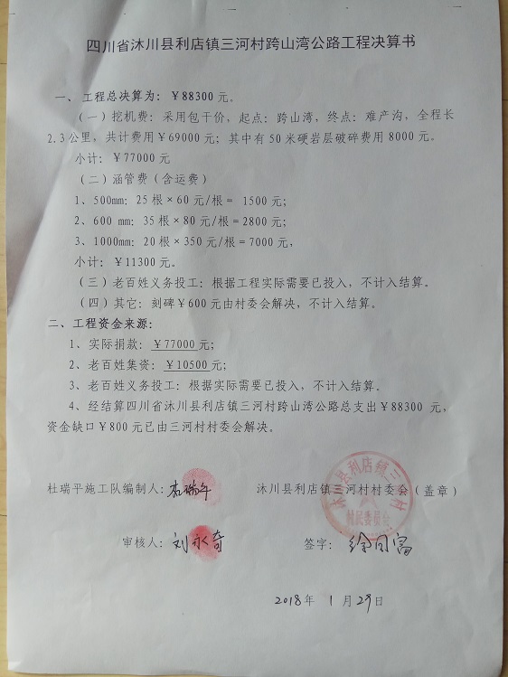 (5)修路预算分好几部分,有挖掘机、涵管、炸药爆破(山崖需要爆破)、堡坎、村民义务工、征地等。修路,我们不全包,我们出一大部分钱:挖掘费用、山崖爆破等。村民出义务工、涵管、征地费、村民小额集资。