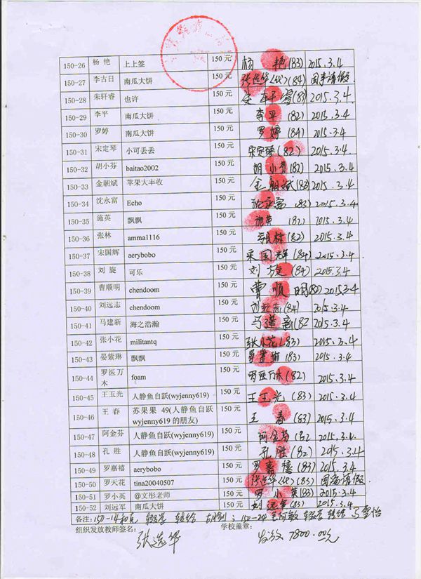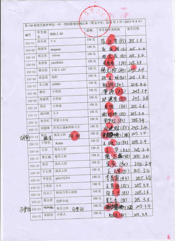 第150批翠玉中学(2015年3月-2015年8月)受助生签收单