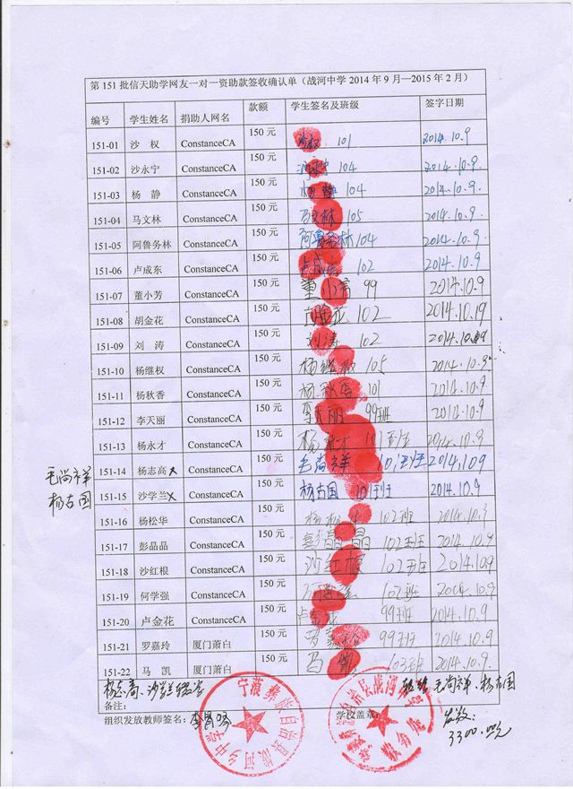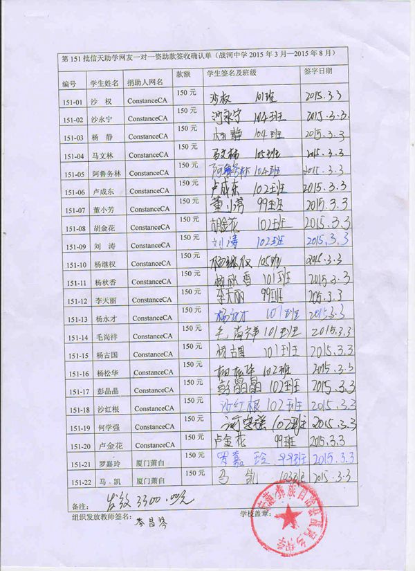 第151批战河中学(2015年3月-2015年8月)受助学生签字确认单